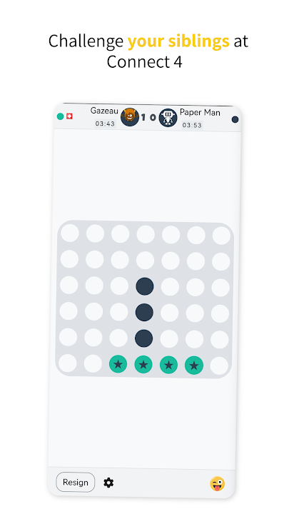 🔵🔴 四子棋:一款策略遊戲,玩家的目標是將四個相同顏色的棋子以垂直、水平或對角線的方式連接起來。這款極具挑戰性的遊戲在熟悉的玩法基礎上增加了戰略難度,您可以進行私人比賽或錦標賽。