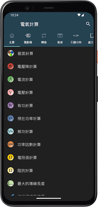 截面計算,電壓降計算,電流計算,電壓計算,有功計算,視在功率計算,無功計算,功率因數計算,電阻值計算,阻抗計算,最大的導線長度,絕緣導線載流量,裸導線載流量,母線載流量,管線填充,調整斷路器,電纜允許通過能量 (K²S²),工作電流,電抗,電阻和電抗的阻抗,功率因數補償,變壓器高低壓功率因數校正,不同電壓下的電容器功率,接地系統,短路電流Maximum,短路電流Minimum,與變電站短路電流,導體電阻,電纜溫度計算,電纜功率損耗,中性電流,電阻顏色代碼,電感色彩代碼,阻值對應色碼,貼片電阻代碼,電容器代碼,電容器代碼表,電感代碼,熔絲,求取總電阻,求取總電容,諧振頻率,分壓器,分流器,齊納二極體作穩壓用,分壓電阻,二極體用電阻,電池壽命,變壓器一次二次繞組,天線長度,CCTV Harddrive/Bandwidth 計算器,溫度傳感器 (PT/NI/CU, NTC, 熱電偶…),類比信號值 (範圍之間的轉換),焦耳效應,大氣引起的過電壓的風險評估,三相故障電流。