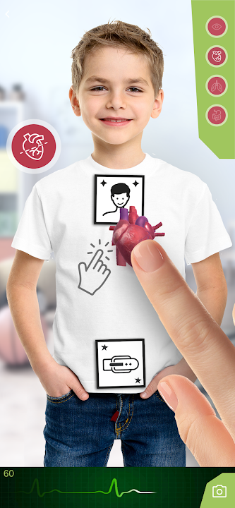 AR模式:通过在脖子和腰部的高度固定特殊的TAG卡,您将能够看到在增强现实中投影的内脏,就像对您的身体进行真实扫描一样!在此模式下,您还可以与设备交互,检查一些参数以了解它们的工作原理。