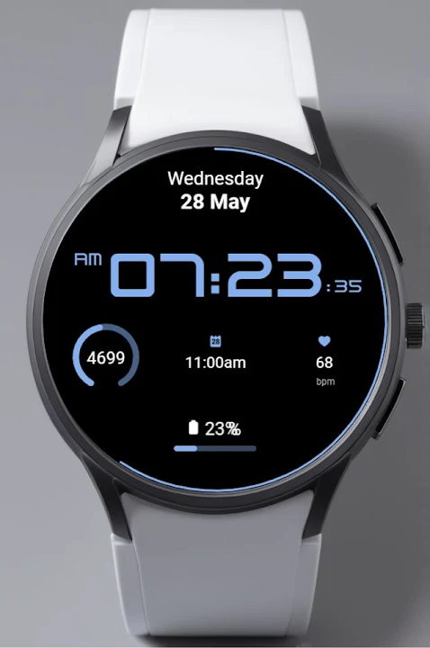 Watch face with digital clock, date, battery level and three configurable complications.