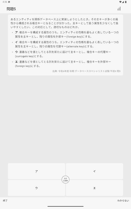 This is an app that allows you to efficiently study past questions from Morning II of the Database Specialist Examination.