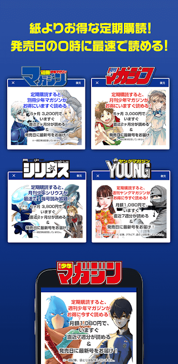适用对象:本应用内发行的各期杂志(《周刊少年杂志》、《Young Magazine》、《别册少年杂志》、《月刊少年杂志》、《月刊少年Sirius》)