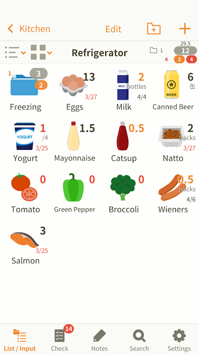 例如,输入冰箱或厨房储藏室中商品的件数或有效期。使用时减去数量,补充库存时加上数量。