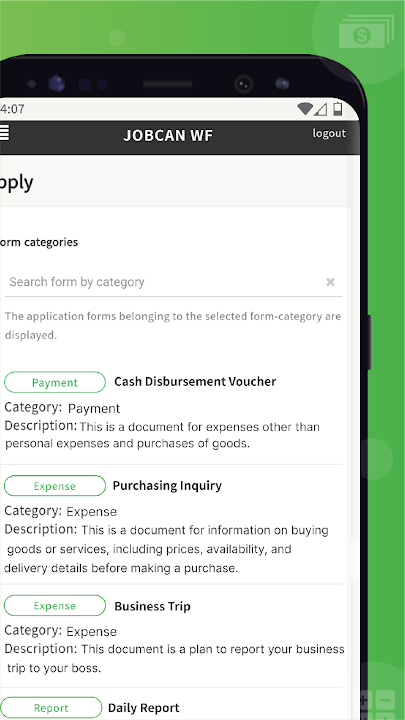 Jobcan Workflow 是一項基於雲端的服務,讓您通過雲端處理公司內的各種申請,以及隨時隨地申請和批准申請。