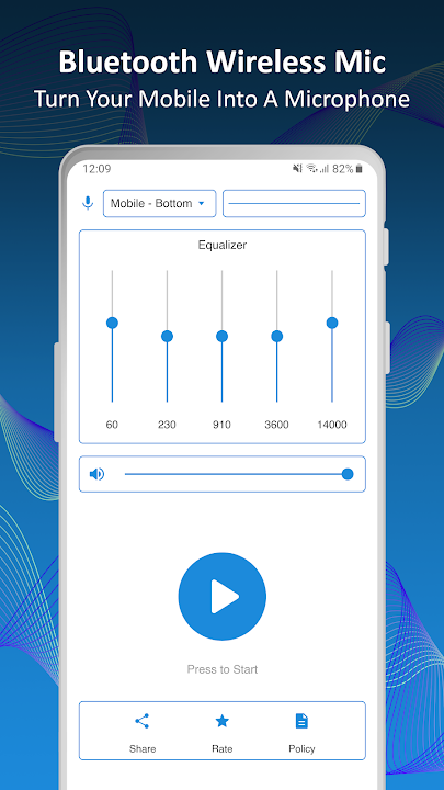 With Bluetooth Wireless Microphone you can easily create mic to speaker connection through Bluetooth or any AUX cable. This Bluetooth Microphone app captures voice from the mobile's microphone and directly plays to the bluetooth speaker or any other connected speaker. It also has the option to select from available microphones. You can enhance your voice with the built-in equalizer.