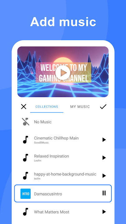 3. Add your own music, trim audio song to sync with background video.