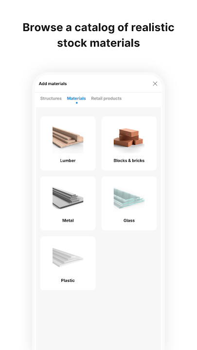 • Add materials like 2x4 lumber, plywood, metal tubing, glass
