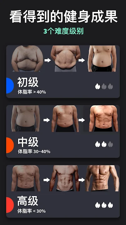 提供3个难度级别的训练,适用于所有人,包括初学者和专业人士。由专业的健身教练设计,专注解决男性麻烦部位,腹部,胸部,帮助您快速减肥并练出腹肌。每天都有不同的锻炼,让您时刻保持新鲜感,轻松坚持下去。