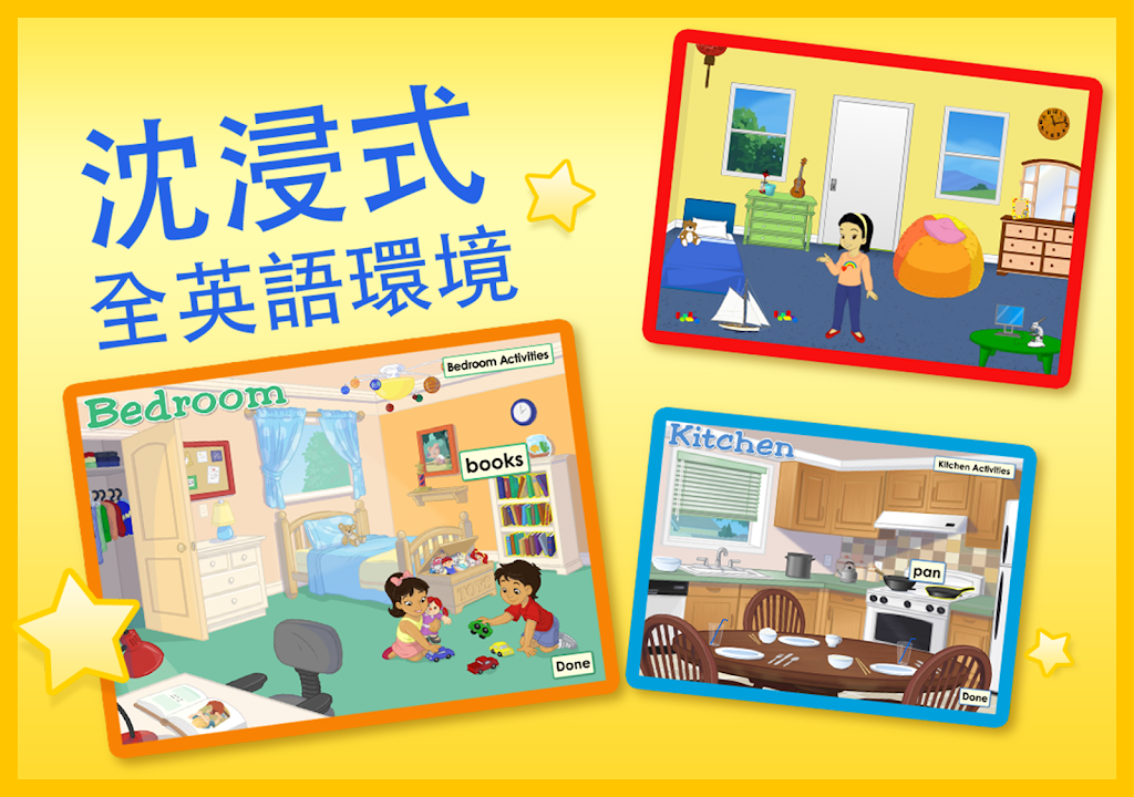 It also has a series of realistic virtual environment, such as: interactive English classrooms, farms, zoos, pet park, malls and movie theaters, and so on. Kids will like immersive general, steeped in reality, an English-rich environment, listen and feel the usual pure American English, and happy to learn.