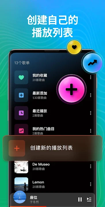 智能追踪你的听歌习惯,并为你自动生成诸如“最近播放”、“最多播放”和“为你精选”等的专属歌单。同时,你可以用音乐播放器轻松管理所有本地音乐,快速搜索歌曲、个性化定制你的音乐库、创建歌单、隐藏或收藏歌曲……