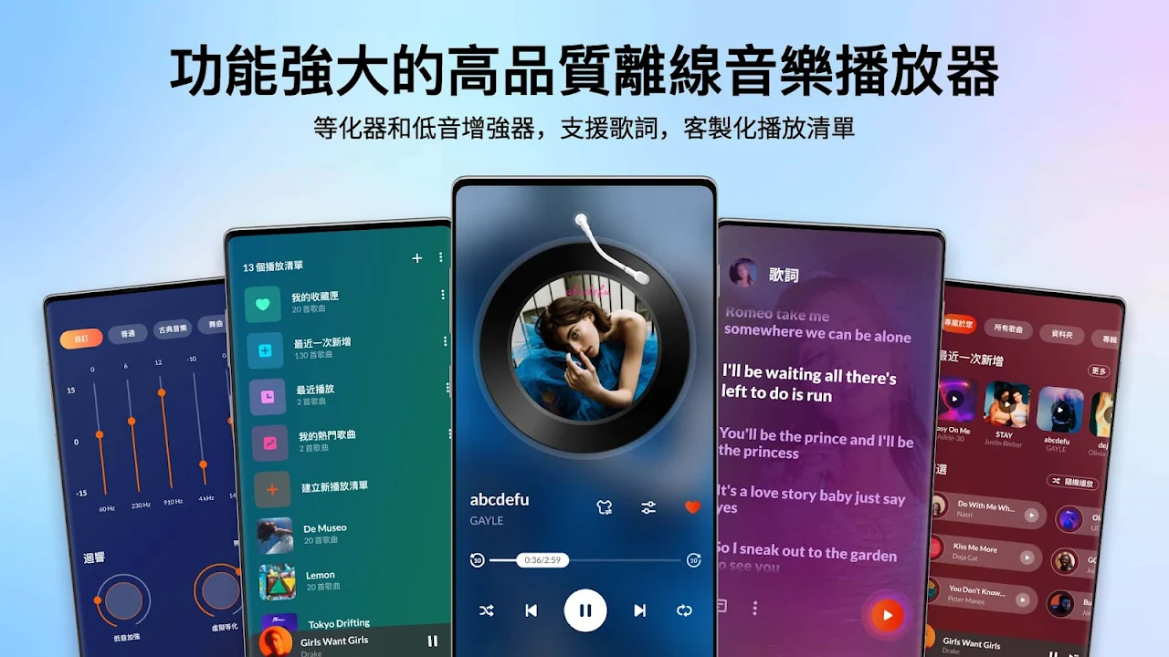 離線音樂播放器和 MP3 播放器。享受高品质音乐,支援歌词与均衡器,打造一流的聽歌體驗!