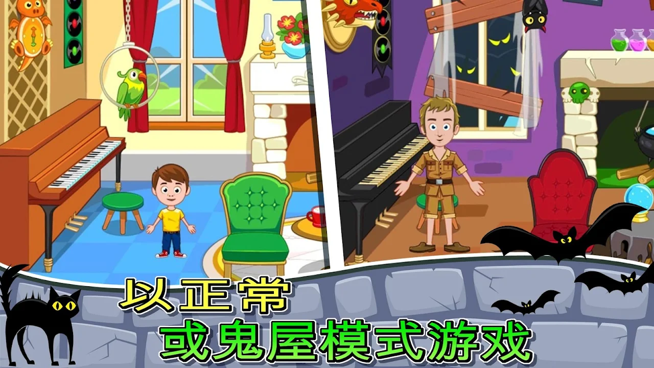 My Town的巨型鬼屋有很多可探索的房间,让你玩个够。轻按开关可改变所有房间,将房舍变成鬼屋。