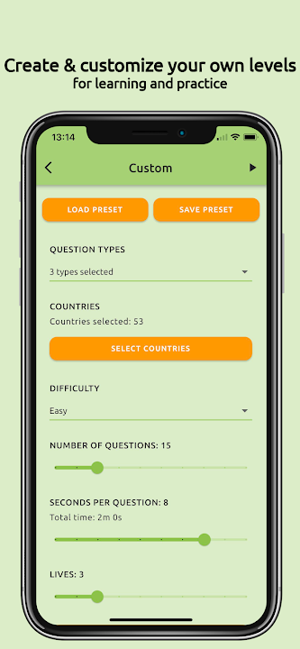 - 自定義您自己的級別(學習什麼、哪些國家和難度)。