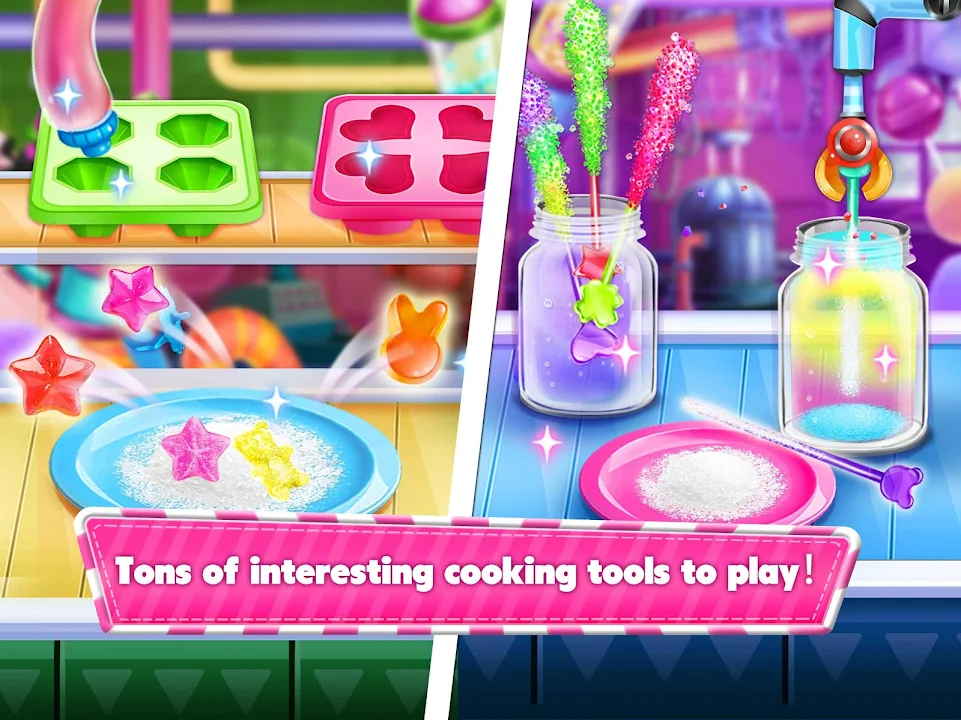 -Tons of realistic cooking tools to play: candy ring molds, candy ring base, induction cooker, mixing machine, water machine, glass jars, stationary machine, clamp machine, gummy candy molds, freezer, spatula, baking pan, weigh, bowls, rolling pin, cutting board, fryer, food masher and so much more
