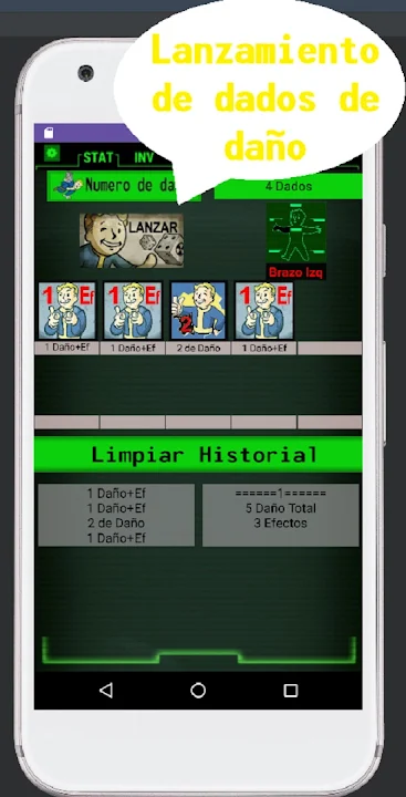 Application to throw dice (CD) in the FO role-playing game with 2d20 rules, together with the calculation of damage and effects, the location of the damage is shown.