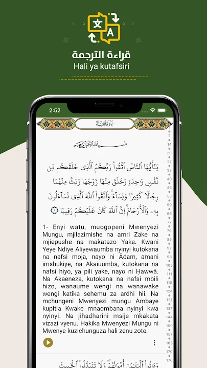 - Translation of the meaning of the words of the Holy Qur'an, understand the Holy Qur'an in your language through the translation of its meaning in the Kiswahili language