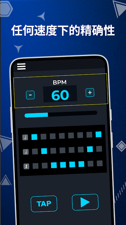 • 直观且用户友好的界面:设计简洁易用,带有易于增加和减少节奏的控件和大而清晰的按钮。