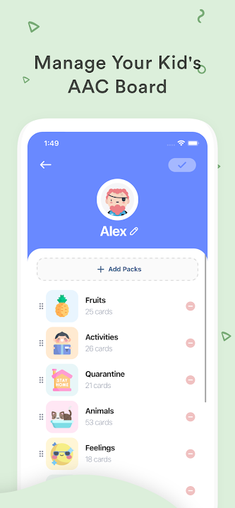 在此应用中,您的孩子每天可能需要使用的每个单词都有一张卡片。每张卡片都与有关您孩子试图交流的短语或单词的确定矢量图像相匹配。