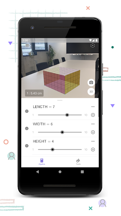 Easily solve 3D math problems, graph 3D functions and surfaces, create geometric constructions in 3D, save and share your results. With Augmented Reality enabled, you can place math objects on any surface and walk around them! Millions of people around the world use GeoGebra to learn mathematics and science. Join us: Dynamic Mathematics for everyone!