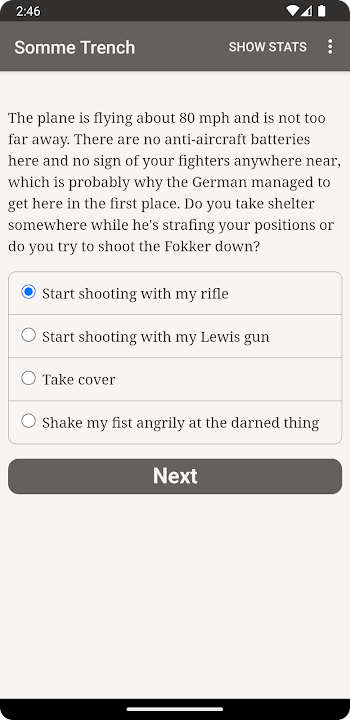 你最好的選擇可能是因為飛機上的砲手,或溝槽戰鬥機,甚至作為一個擔架。射擊隊,妓院和回家的方向輪船都在你的未來可能。或者你可能在你的內心的惡魔給予和風與鬼怪和骷髏聊天,就好像他們是你的朋友。無論路徑選擇,你會沉浸在擁有幾乎同樣多的曲折和有士兵在索姆河一個細節豐富,互動的歷史小說。