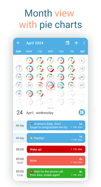 The list of your calendar events is projected in the form of a pie chart in the application and on the home screen widget.