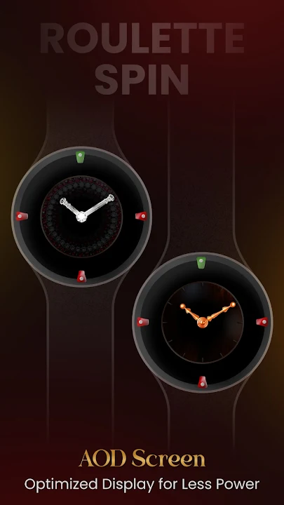 享受帶有輪盤主題錶盤和基本智慧手錶功能的動態類比錶盤。設計的核心是一個像真正的旋轉輪一樣轉動的輪盤。只需輕敲錶盤的中心,輪子就會隨著白球旋轉,停在一個隨機數字上——就像真正的輪盤旋轉一樣。