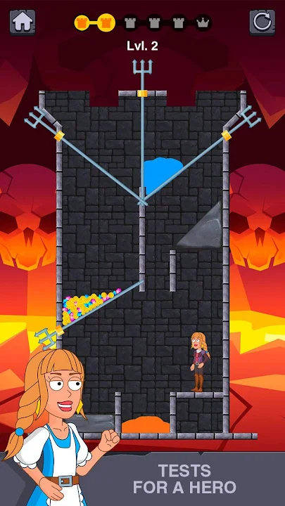 救援女孩是一次生動的冒險,您需要拯救一個女孩並幫助她從地獄中逃脫。您需要解決難題,並完成城堡和地牢中的關卡。如圖所示,將銷釘拉出桿,然後將銷釘銷移動。還要穿過房間,然後從不同的動作中進行選擇:只有一種選擇可以拯救女孩。釋放其他俘虜並收集寶藏。