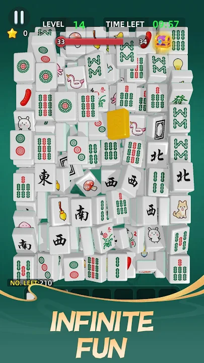 - 点击桌子上的瓦片3D并放置到您的收藏栏中,这个栏位有七个位置。成功地堆叠和消除三个相同的瓦片3D,您离麻将接龙的胜利更近一步!通过消除桌子上的所有瓦片3D来进一步前进。