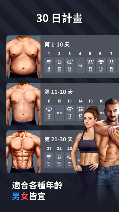 - 30 天鍛鍊運動,助您擁有六塊腹肌與強健的身體