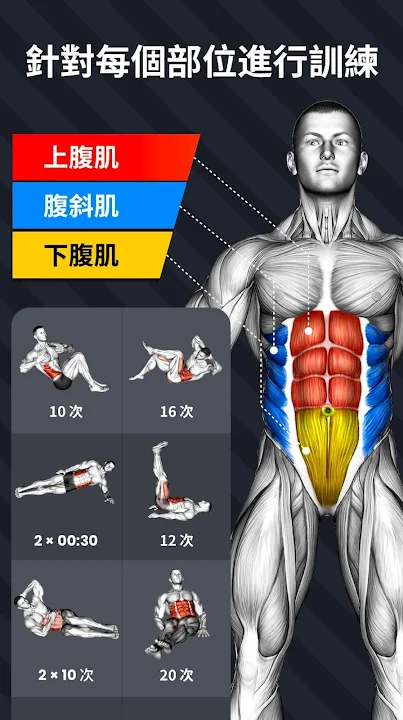 有效的腹肌鍛鍊,提供不同等級的運動計畫。在家就能減脂並練出六塊腹肌!