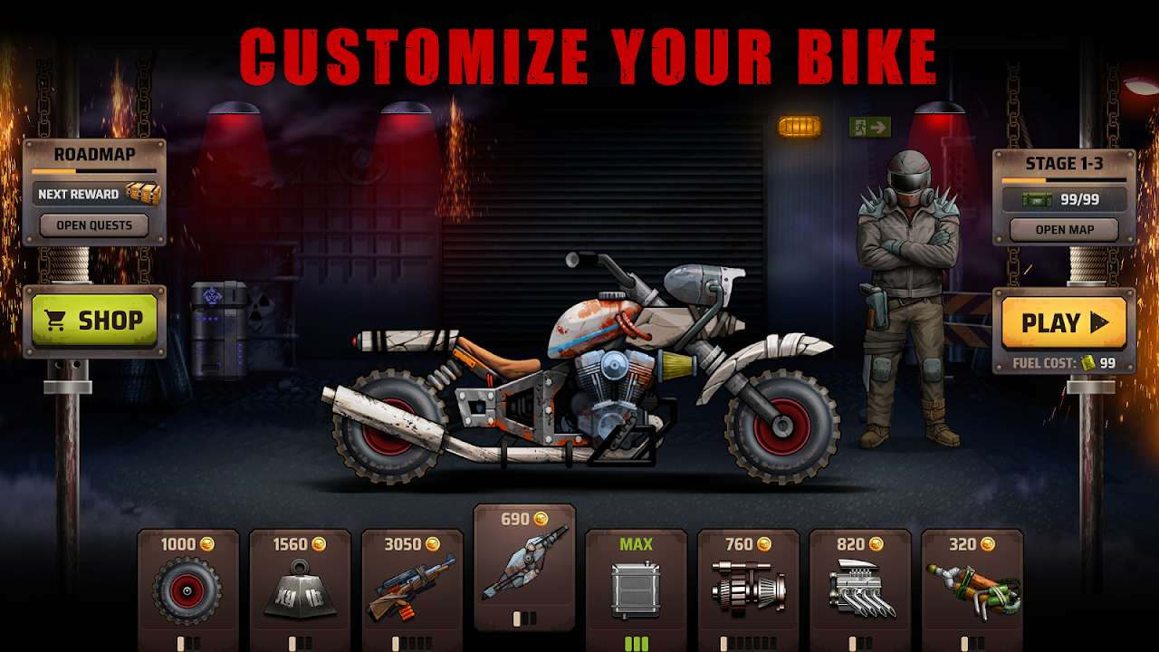 Explore an expansive and thrilling Map with a lot of stages. Drive ahead and unlock infested up hill racing worlds. Each new zombie highway brings tougher enemies and stronger bikes ready to crush zombies under its wheels.