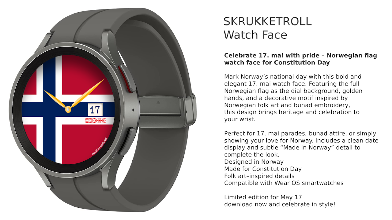 自豪地穿著挪威國旗 – 17.mai 🇳🇴 的 Wear OS 錶盤
