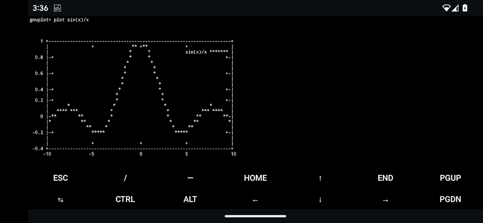 This is really gnuplot running on your device. It is full featured and professionally supported. This runs the Linux desktop edition of gnuplot.
