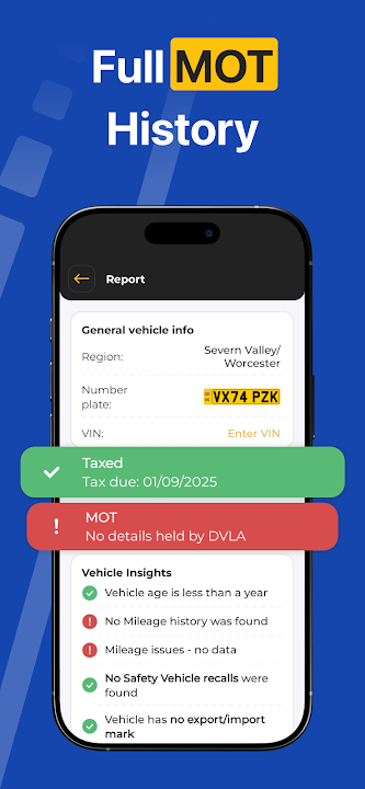 Our vehicle information app reveals the following information based on data provided by the Driver and Vehicle Standards Agency (DVSA), the Association of British Insurers (ABI), the Police, the Individual Insolvency Register, etc.: