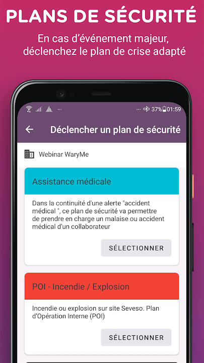 Equip your employees WaryMe the application and create a direct link with your security team. Involving them in the safety device allows to react, decide and communicate quickly in a crisis. It also participates in the development of the culture of risk and collective security.