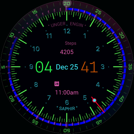 在兩個大小時標記之間,有一個較長的半小時標記、兩個刻鐘標記和五分鐘的細標記。因此,可以用指針讀取時間,精確度為 5 分鐘。