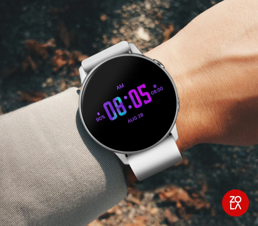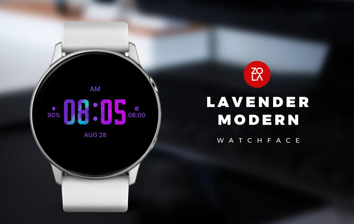 薰衣草色現代錶盤,適用於 Wear OS,精美的數位錶盤採用簡約現代的設計,注重易讀性和易用性。