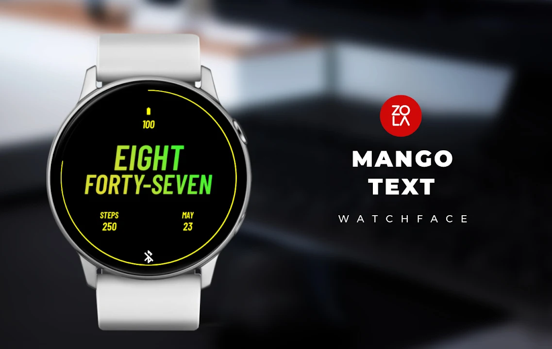 Introducing the Mango Text Watch Face for Wear OS. This stylish digital watch face features typewriter text in vibrant green and yellow colors. Perfect for adding a pop of color to your everyday look.