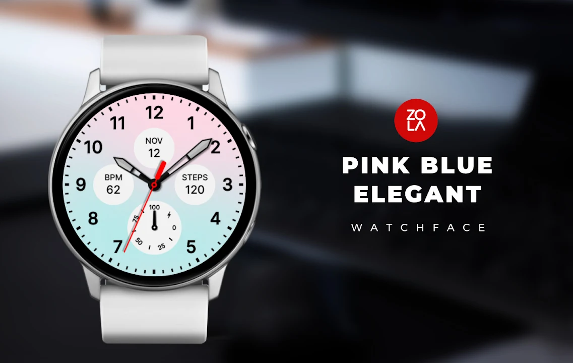 Elegant pink and blue analog watch face for Wear OS. Stay stylish and make a statement with this beautifully crafted, modern design.